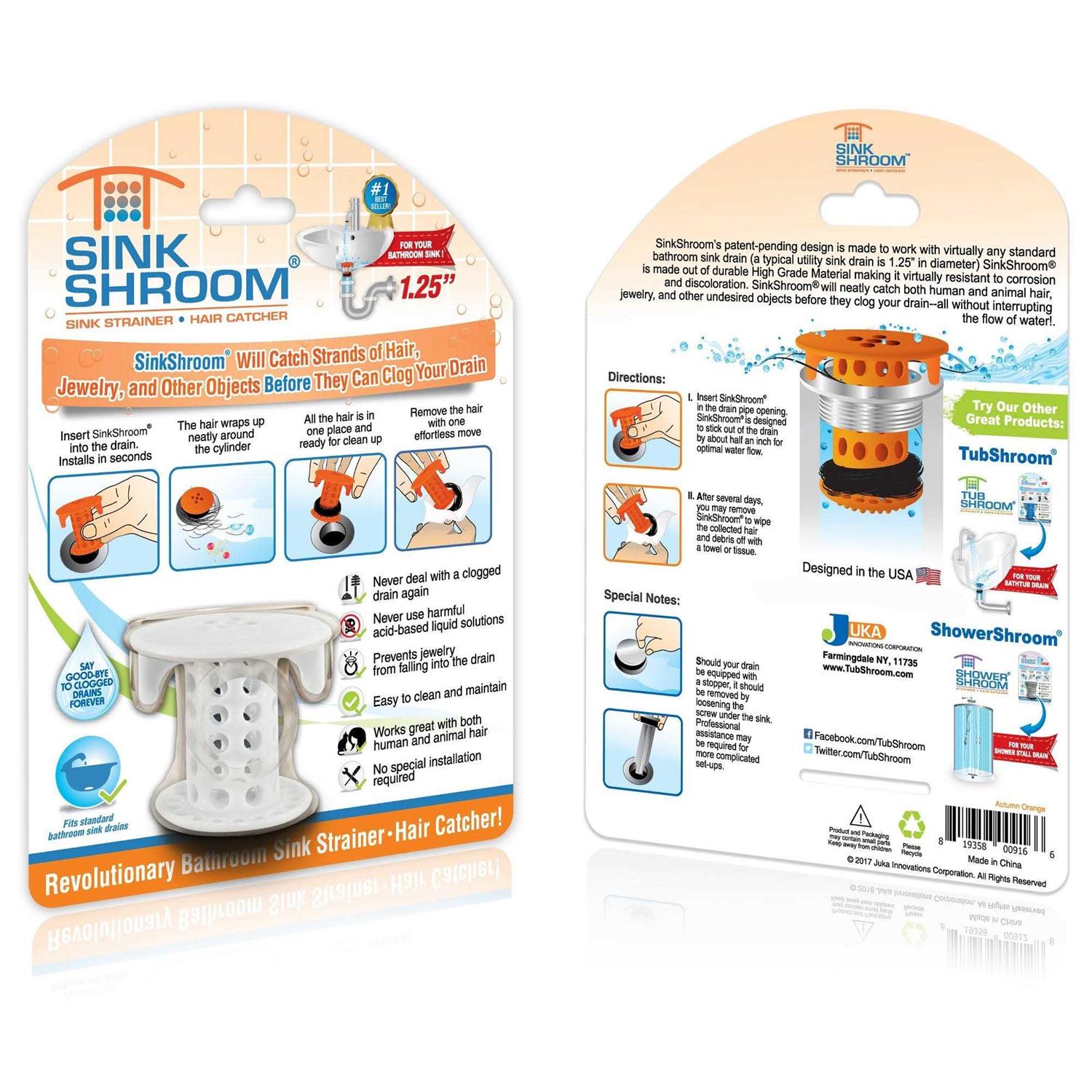 - Unlike regular hair catchers placed over the drain, SinkShroom fits inside, neatly collecting every hair