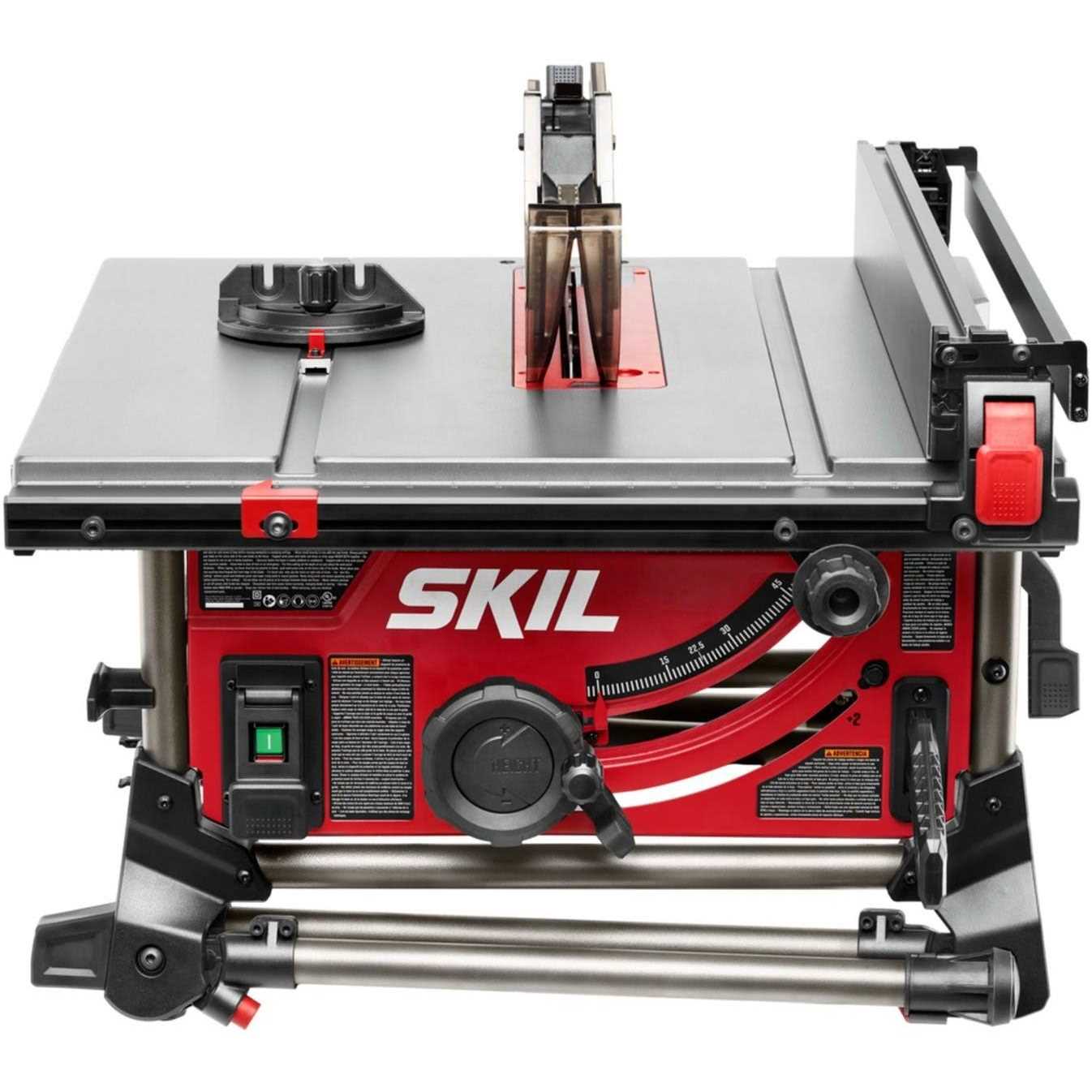 The SKIL TS6307-00 10 in jobsite table saw has a 25-1/2 in 64.77 cm rip capacity and is equipped with a 15 A motor integrated foldable legs rack and pinion fence rails and a dust port elbow to keep your jobsite clean. The 15 A motor quickly rips through hardwoods with ease while the rack and pinion fence rails make fence adjustments fast smooth and accurate. With its 0 to 45 deg bevel capacity the quick release lever allows for cuts between two positive stops at 0 and 45 deg and its 4 x 4 cutting capacity allows for swift 90 deg cutting. The integrated foldable legs seamlessly form into a folding stand to provide portability and convenience while the dust port elbow systematically redirects dust to a container for easy cleanup. This large coated cast aluminum tabletop saw comes equipped with a 10 in 24-teeth carbide blade. The parallel blade alignment allows for ease of blade adjustment along the rip fence and miter slot for precise accurate cuts. This table saw features a safety anti-restart switch in case of power outages.