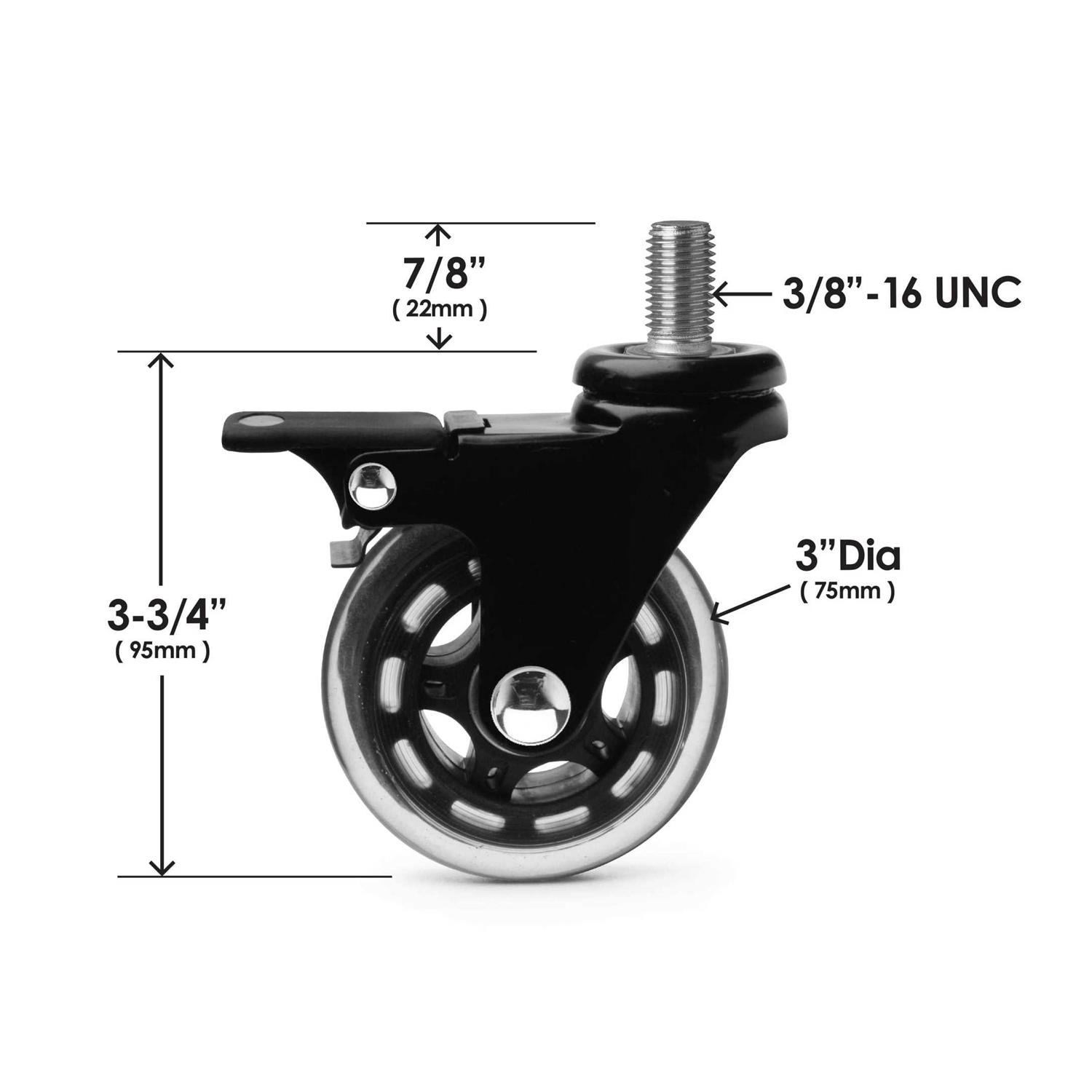 Slipstick CB693 Premium 3 Inch Rubber Caster Wheels with Brake Replacement Rollerblade Style Swivel Casters with 3/8”– 16×1” Threaded Stem