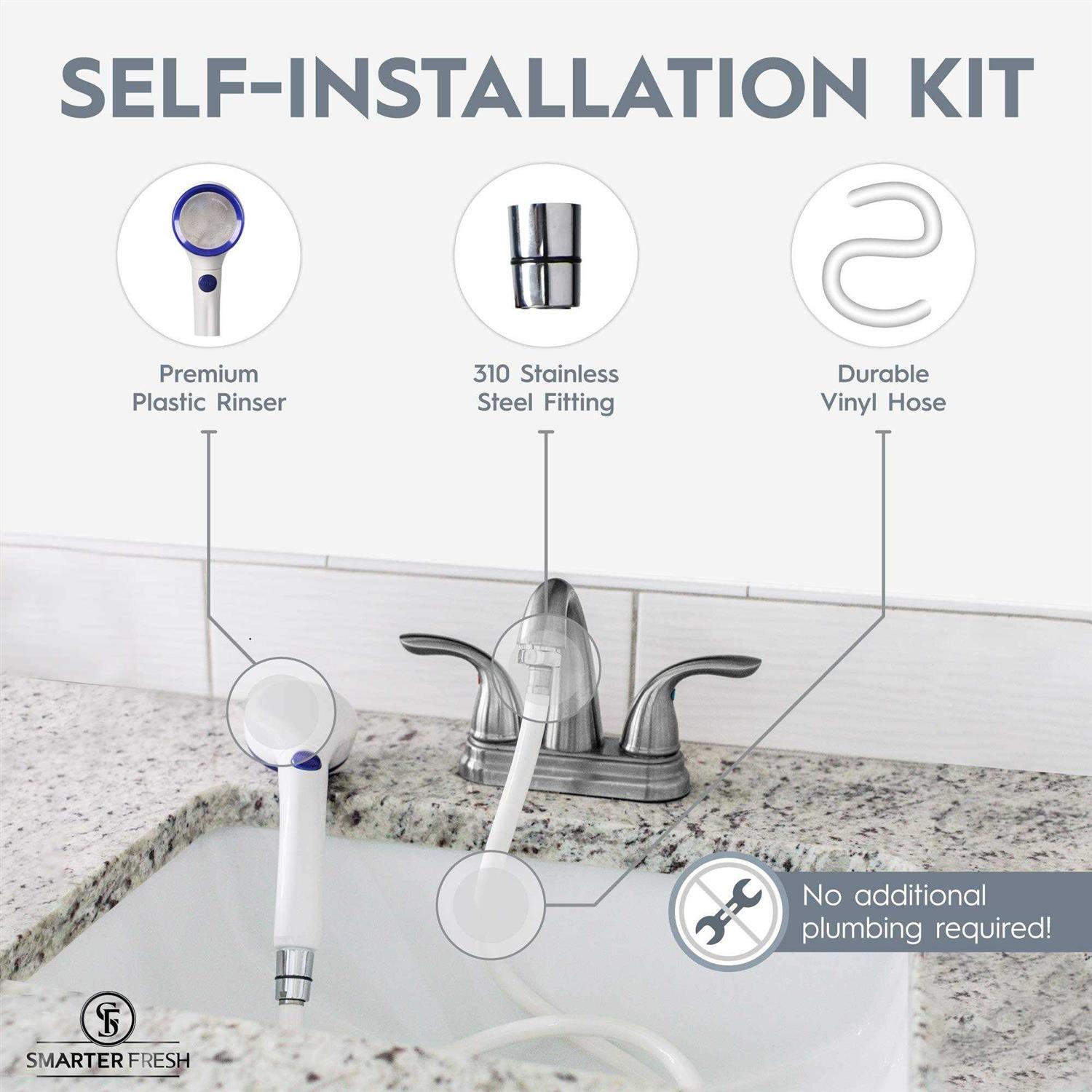 Introducing the SmarterFresh Sink Faucet Sprayer Attachment – the perfect tool to simplify your cleaning routine and expand the versatility of your sink. With our durable and easy-to-use attachment, you can complete a variety of tasks, from washing your hair to filling up a bucket, in no time. Our sink faucet sprayer attachment features on/off flow control, allowing you to efficiently use water and minimize trips to the sink. Made of high-density, shatter-resistant plastic and pure 310 stainless steel fittings, our handshower is built to last. The tough, durable vinyl hose measures 5-feet long and is perfect for those hard-to-reach areas. Installing the attachment is a breeze, with no special tools or professional help required. In fact, you can complete the installation in just 5 minutes with our included instructions. With the SmarterFresh Sink Faucet Sprayer Attachment, you can enjoy the convenience of extending your faucet by 5 feet. Plus, our attachment is only compatible with sinks with removable aerators. Upgrade your sink-use with this easy DIY project and achieve a new level of convenience and time-saving efficiency. Don’t wait, order now and start enjoying the benefits of the SmarterFresh Sink Faucet Sprayer Attachment!