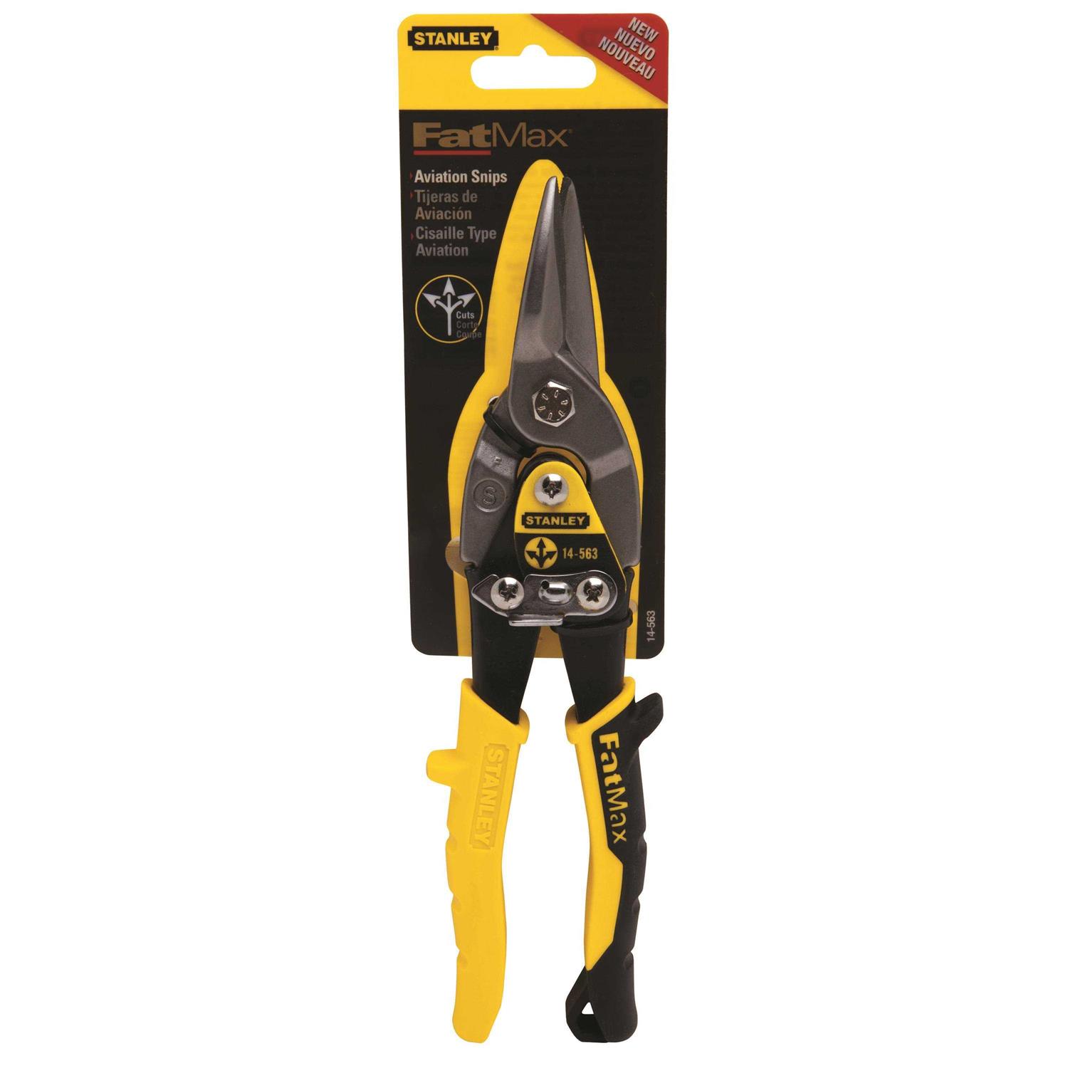 Stanley FatMax 14-563W Straight-Cut Aviation Snips make a versatile addition to a toolbox. They are equipped with a double over wind spring for longer life and feature serrated cutting edges that prevent materials from slipping. A special compound design enables them to cut up to 18-gauge steel. Slip-resistant cushions provide for a secure grip, and a built-in security latch automatically releases with the squeeze of the handles. These Stanley snips are suitable for cutting aluminum, vinyl siding, screening, cardboard, leather and copper.