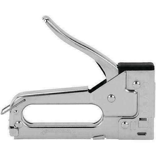 Easy squeeze stapler ideal for home and office. Lightweight with convenient handle lock and quick clear mechanism. Chrome-plated steel construction. Uses Stanley model No. TRA204 and TRA205, and Arrow model No. JT-21 light-duty staples.