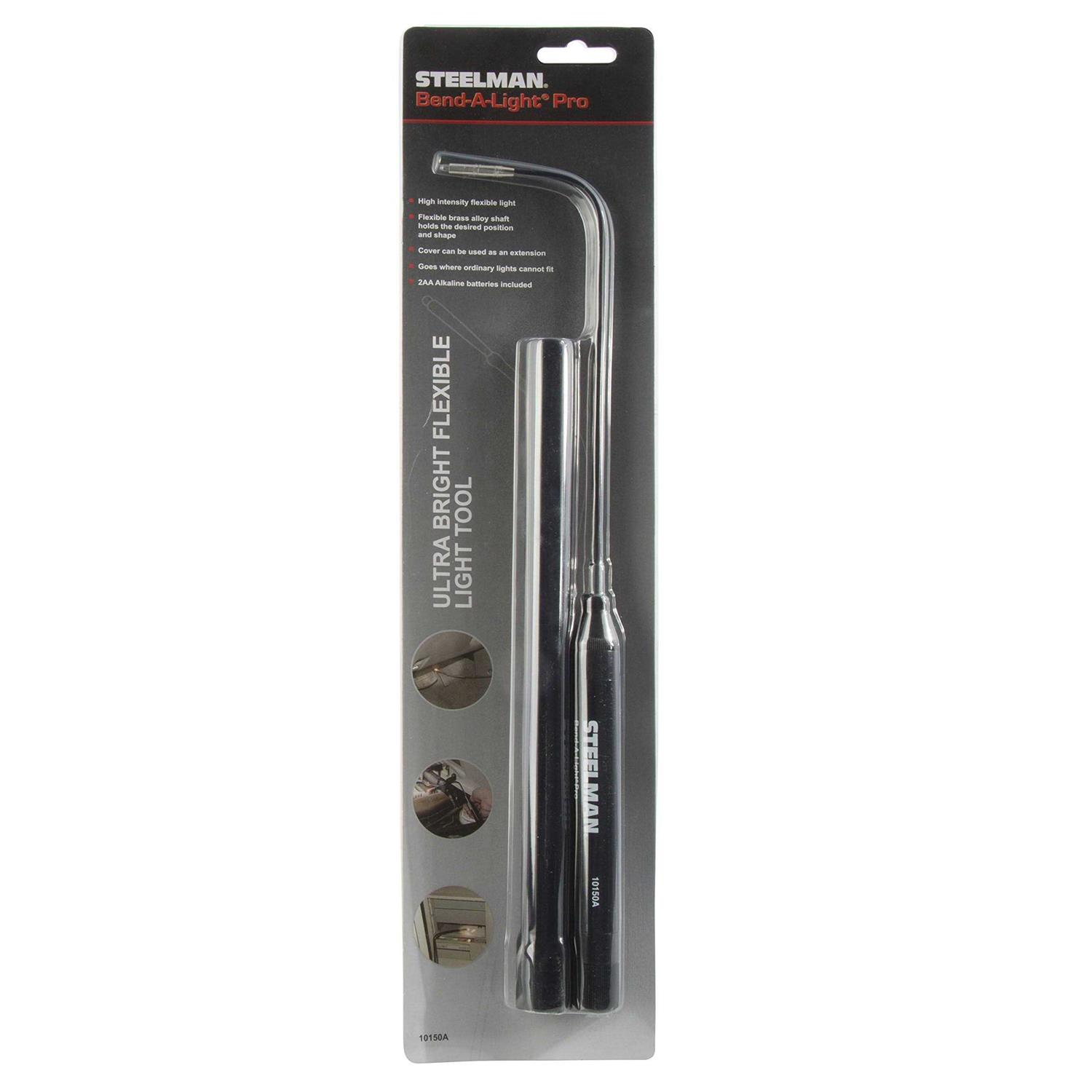 Measuring in at 15.75-inches overall, this light has a 9.5-inch long flexible gooseneck whose brass alloy construction lets it retain shape when bent or twisted to allow it to easily reach around corners and obstructions. The compact 5/32-inch diameter tip is small enough for the light to be used in a wide range of tasks including heavy machinery inspections, automotive engine troubleshooting, as a bore light for gun maintenance, or for computer and electronics repair / inspections. A protective cover is included to prevent damage to the bulb or gooseneck during storage that can double as a handle extension to provide additional reach into recessed inspection areas. Two (2) AA alkaline batteries are included for your convenience. Filaments in the tiny, high intensity incandescent bulb can last for up to 4 hours of continuous runtime. When burned out or in the event of breakage, the bulb is designed to be easily replaced using the STEELMAN 12100 Bend-A-Light Pro Replacement Bulb.