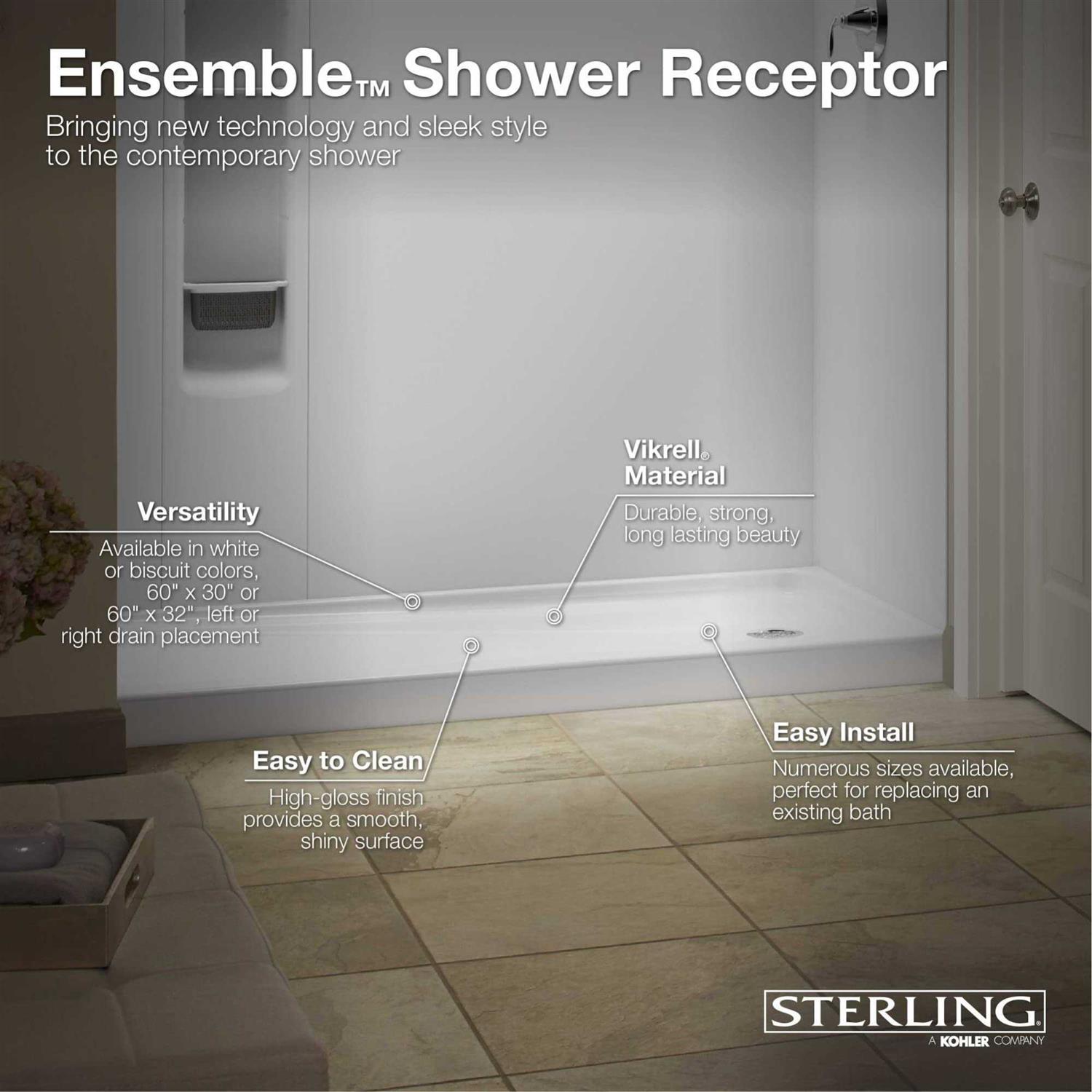 Perfect for tile-down applications, the ensemble 42 In. shower receptor customizes your look without the worry of a tile receptor. The effortless installation and receptor dimensions make replacing a standard 5 Ft. bath quick and easy — great for any bathroom remodel. It’s made of solid vikrellmaterial for strength, durability and lasting beauty and has no layers so it won’t chip, crack or peel. The durable high-gloss finish provides a smooth, shiny surface that is easy to clean. The receptor install options include: tile install, Ensemble tile wall surround, and Ensemble curve wall surround.