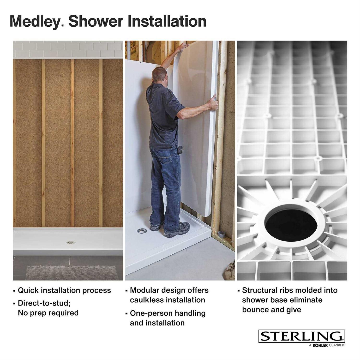 - “Smooth wall design with molded-in shelves and shaving ledges”