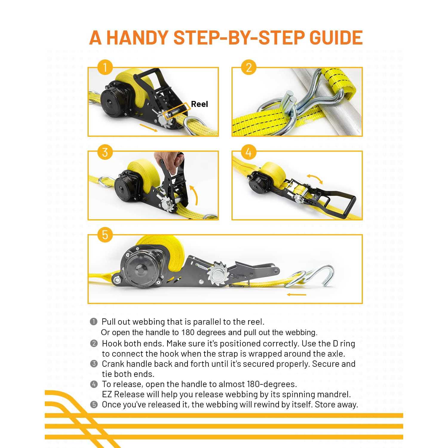 Smart Rewind Mechanism. Keep your vehicle and cargo safe in transportation. Our retractable ratchet strap enables you to tie down and release fast, easy, and securely. It’s reusable for hauling. Tangle-Free Release. With 6,600lbs breaking strength, our retractable strap releases without tangling and rolls back up easily. It can also be secured with D rings and double J-Hook on both ends. Ready-To-Use Anytime. Have peace of mind and say goodbye to excess webbing or tying ends off. Even with our wider and larger straps, the webbing releases effortlessly. It’s easily stored away, too. Superior Quality. Our ratchet buckle is guaranteed rust-resistant with the salt spray test, made from 1.5 in. wide durable polyester webbing and solid hardware. Its durability will last a long time. Haul With Ease and Confidence. Strapping has never been easier. Simply pull out the webbing. Hook both ends. Crank the handle and release. After a few uses, you’d be confident to haul away! Standout Straps For Everyone Ratchet straps have been around for a while. Historically used in the transportation industry, it has evolved to be a must-have in every household. With STRAPINNO’s retractable ratchet strap, you don’t have to worry about spooling, dealing with extra length, and loose webbing. Our strap comes with D rings and double J-Hook on both ends. You can tie it down by wrapping the strap around the axle and hook the D ring. Be confident to use our ratchet straps without hesitation when hauling your belongings. Securely tie down your dirtbike, ATV, jetski, boat, equipment, and other cargo via trailers or pickups. Drive with confidence with our heavy-duty ratchet straps and never worry about loose webbing again. How To Use Retractable Ratchet Strap 1. Pull out webbing that is parallel to the reel. 2. Hook both ends. Make sure it’s positioned correctly. Use the D ring to connect the hook when the strap is wrapped around the axle. 3. Crank handle back and forth until it’s secured properly. Secure and tie both ends. 4. To release, open the handle to almost 180-degrees. EZ Release will help your release webbing by its spinning mandrel. 5. Once you’ve released it, the webbing will rewind by itself. Store away. Product Details In The Package Note: Use a proper ratchet strap according to your car type or cargo. Kindly use it within the capacity load. → 1pc. RA15020 Double-J hook and D Ring on both ends 1.5 in. wide x 20 ft. long webbing 6,600lbs (3,000kg) Breaking Strength 2,200lbs (1,000kg) Working Load Limit Buckle Size: 10.6 x 4.3 inches
