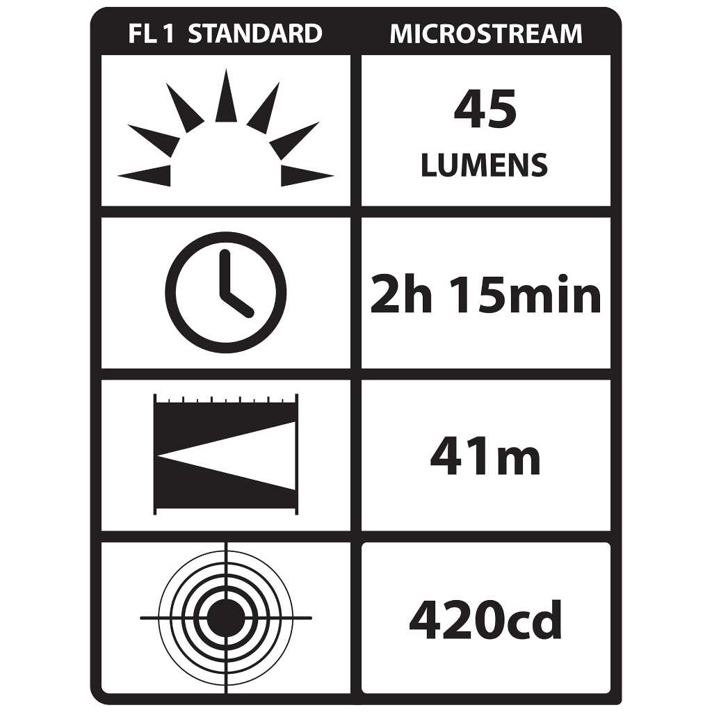 - White C4 LED delivers 45 Lumens; 420 candela; 41M beam; Runs 225 hours