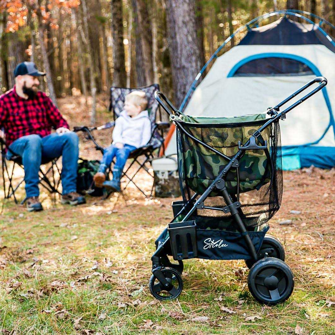 Including oversized umbrellas, towels, folding beach chairs, fishing rods, and plenty of toys for the kiddos! All Surface Ready- Our unique wheels were designed and built with all surfaces in mind. The heavy-duty front casters and rubber center strip in the rear wheels provides smooth, quiet rolling on concrete without needing to inflate or worry about a flat tire on vacation. For the extra soft beach sands (think Florida) the rear wheels were widened to prevent sinking in. Strolee carts are best pushed on hard surfaces & pulled on soft. Lightweight & Collapsible – Our frame is made from lightweight rust-free aluminum alloy so the entire cart weighs in at just 15Lbs and can be completely folded with the push of 2 buttons to fit in ANY trunk. Simply unbox, snap the wheels on and you’re ready for the beach! Make your day at the beach or soccer field hassle-free with Strolee. Interchangeable, locking wheels allow you to push or pull your Strolee over all types of sand and terrain. Standard beach chairs simply slide over the extended front bar, while tube-style folding chairs attach on either side of the cart. Packing up from your outdoor adventure is never fun, but our recreational utility carts make it simple so you don’t have to worry about taking multiple trips back and forth to your car. Don’t let the last 500 feet to the beach ruin your whole day, let Strolee lead the way!