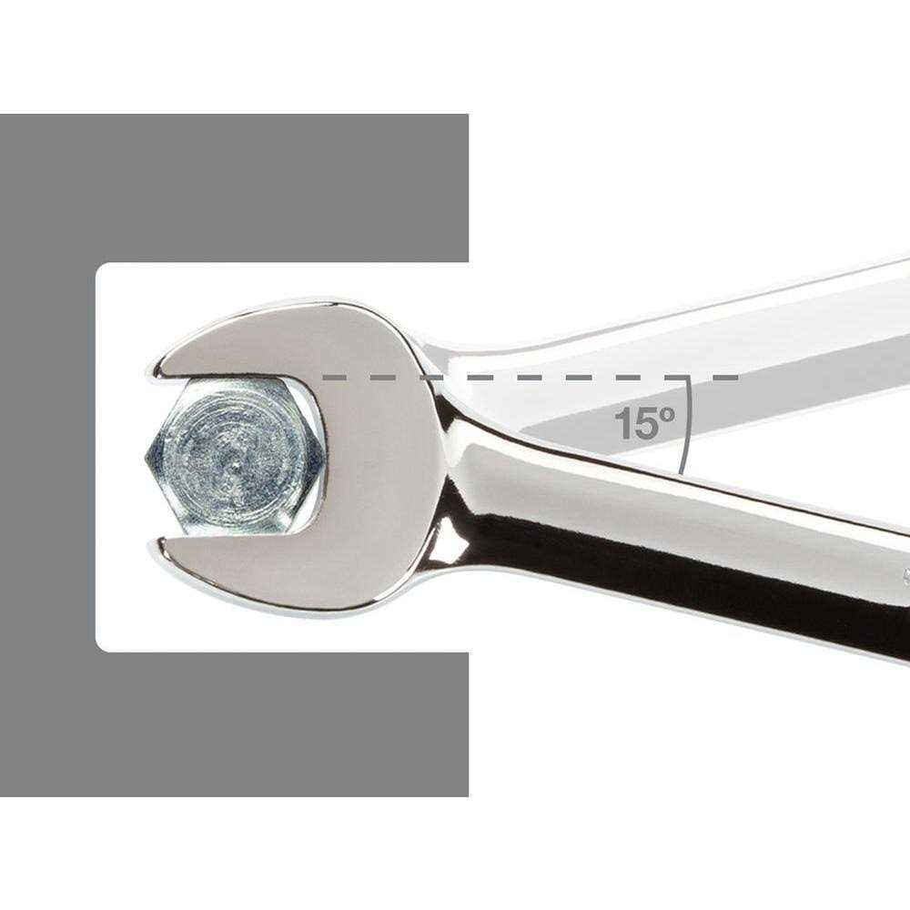 - Open end is angled 15 degrees so the wrench can be flipped over to engage fasteners twice as often in tight spaces
