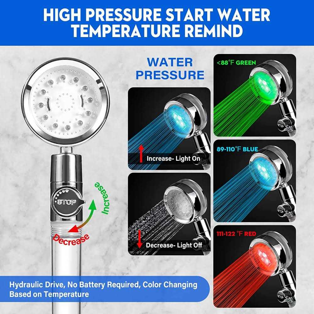 【High Quality Materials】-LED shower head with handheld which has universal 360° rotation makes of durable ABS material and stainless steel panel. Shower heads high pressure hydro jet shower head also has hose & holder, they are coated with an anticorrosive layer to prevent rust. 【One-Key Control】-Shower heads high pressure hydro jet shower head with hose uses independent switch design, only need to press or rotate “STOP” key to allows you to turn on or off the water & adjust the amount of water at any time. ATTENTION:Rotate the “STOP” Key, water flow increases- LED color change green, blue, red; water flow decreases- LED light turn off. 【Temperature Based Led Changing 】-The LED shower head with hose is powered by water and doesn’t require batteries. LED light color changes with water temperature (<88°F green; 89-110°F blue; 111-122 °F red ) ATTENTION:When Red Light Flashing, Mean High Heat Over 124 °F! 【Filtration Design】-This LED shower head with handheld contains 5 high-quality PP cottons (One pre-installed shower head). Filtered shower head can effectively reduce residual impurities, heavy metals, chlorine in the water which make your skin& hair smoother and healthier. 【High Pressure Design】-Shower heads high pressure hydro jet shower head filtered shower head adopts new nozzle design technology makes the water outlet hole more dense, speeding up the water outlet and improving water pressure.