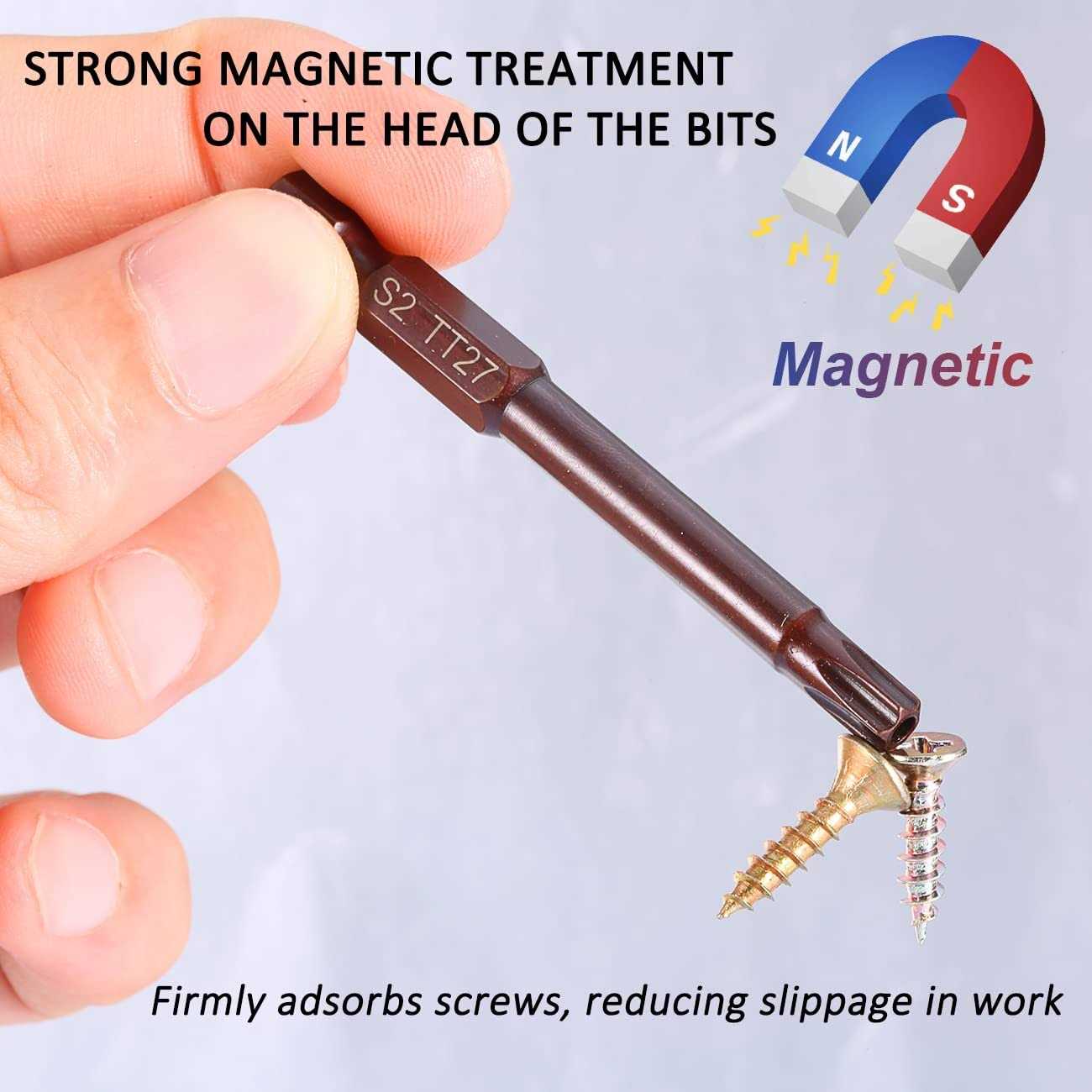 Comprehensive Set: With 24 pieces of security torx bits in two lengths, this torx security screwdriver set offers a wide range of sizes to meet all your needs for different jobs, making it a smart torx bit set for both DIYers and professionals. High-Quality Material: Made of high-quality S2 alloy steel, this torx bits set is heat-treated to HRC58°-60° for excellent hardness and torque, ensuring its long-lasting durability, and providing tamper-proof protection for your devices and equipment. Precision Machining: These star bits feature CNC machining, ensuring their accurate size and shape, so they fit perfectly and securely into the screws, preventing damage to the screws and devices, and thereby extending their lifespan. Easy to Use: The magnetic bits in this long torx bits set make it easy to install and remove screws, reducing the frustration of losing screws or damaging devices. The laser markings on each bit make it easy to identify the size and type of bits, saving time and effort. Versatile Applications: This torx security bit set is suitable for a wide range of applications, such as repairing electronics, appliances, toys, automobiles, bicycles, furniture, and more. With this torx screwdriver bit set, you can tackle any job with ease and confidence. Investing in this torx bits set will ensure that you have the right tool for any job, no matter how big or small. It’s a cost-effective way to save time and money, avoiding the need to buy individual bits as needed.