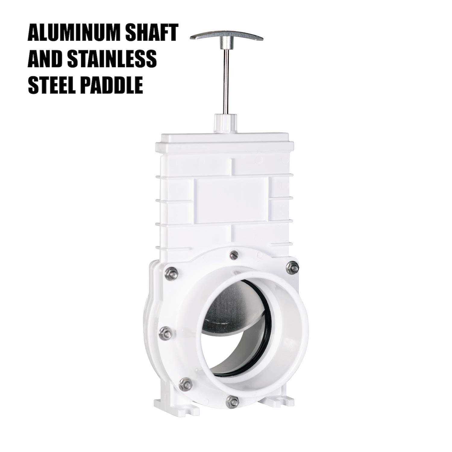 PVC Slice Gate Valve Features Designed for pool & spa, irrigation, plumbing, waste waterand agricultural applications. Stainless steel shaft prevent rust and corrosion. Ozone & chemical resistant Santoprene materials. Santoprene seals are integrated to the paddle to eliminate any chance of torn orpunctured gaskets. Maximum working pressure 50 psi (through 2). Solvent cement traps to catch excess glue. Every valve tested at double recommended working pressure. Valterras patent pending triple o-ring neck seal to ensure against any chance of shaftleakage.3 Piece body Three piece configuration allows for repair or can be used as a union. Three piece configuration easily disassembles for inline service.