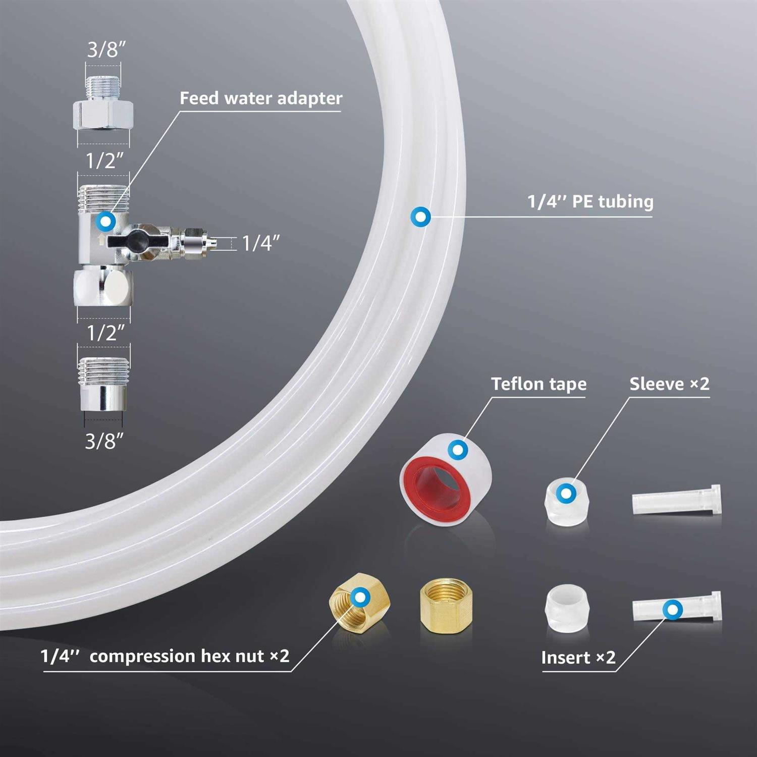 - Inside the kitMetallic Tee feed water adaptor, compression fitting nut *2 sets (2 inserts, 2 sleeves, 2 nuts), 1/4 PE tubing, Teflon tape.